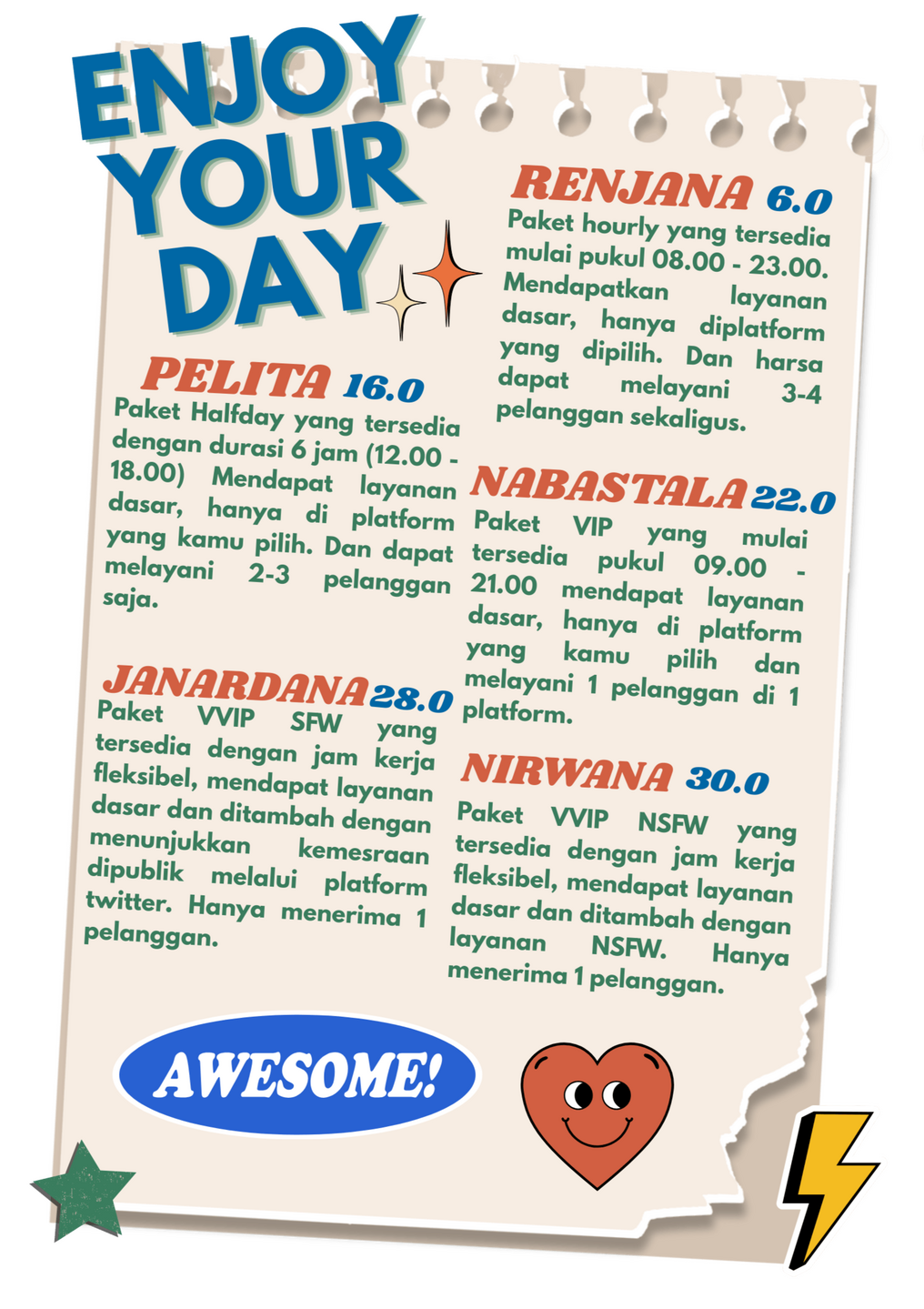 Jam kerja Harsa dimulai pukul 09.00 WIB sampai dengan pukul 21.00 WIB dan jam kerja fleksibel untuk layanan VVIP. Apabila jam kerja telah selesai, Harsa tidak wajib membalas pesan pelanggan jika tidak menambahkan layanan begadang atau memesan paket VVIP.