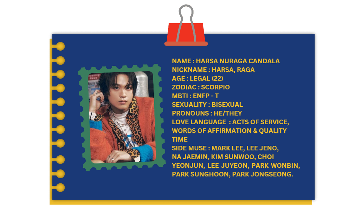 Harsa Nuraga dengan nama ini berharap gua bisa membawa kebahagiaan untuk orang di sekitar gua. Karna Harsa sendiri artinya kebahagiaan. Kalian bisa panggil gua Harsa, Raga atau Cala, asal jangan panggil gua maling, ntar digebukin gua. Gua prefer dikasih petname sayang dari lu, tenang aja gua juga bakal kasih lu petname kok.Mau kenal gua lebih jelas? Kalau gitu ijinin gua pantun dulu, makan bakso di Kuningan, eh tau-tau baksonya asin, halo kesayangan, sini gua jelasin. Gua termasuk tipe orang yang jahil, tapi banyak yang bilang selain jahil gua juga tengil sih, lu kaga percaya? kita adu sini. Gua bisa mati bosan kalo kaga tengil atau usil sama orang di sekitar gua. Meskipun gua tengil, tapi gua ini pendengar yang baik, lu mau cerita ngalor ngidul juga gua mah siap dengerin dan gua juga bisa kasih advice ke lu, itu kalo lu ijinin aja tapi. Intinya kalo lu cerita sama gua, aman dah, gua selalu buang kuncinya biar gua kaga bisa sebar. Gua kaga punya trigger sejauh ini, jadi kita bisa nikmatin waktu dengan ngomongin orang, salah, maksud gua dengan ngomongin hidup yang semakin hari semakin membuat kita garuk kepala. Karna kaga tau lagi mau jalaninnya gimana, tapi kalo dijalaninnya sama gua mah gua yakin jadi lebih berwarna kaga sih? Minimal mirip kayak ayam warna-warni gitulah.Sebagai individu dengan aspek feeling yang dominan, anjay, gua ini bisa memahami emosi orang lain dengan cepat. Kaga sekedar mahamin, gua bahkan sering berusaha memperbaiki perasaan orang lain yang lagi kagak baik-baik aja. Entah gua hibur atau gua kasih encouragement. Gua juga suka banget apresiasi orang-orang di sekitar gua, even yang lu lakuin hal kecil, tapi dari hal kecil itu kan bisa aja jadi hal besar buat orang lain, bener kagak gua?? Bener lah. Gua termasuk pribadi yang supel, mudah beradaptasi, jadi nanti rc kita kaga bakal canggung, karna gua ini anaknya berisik meskipun begitu tentu aja gua orangnya asik anjay, dan emang kaga suka suasana yang canggung, makanya gua selalu berusaha cari topik dari yang menarik hingga buat lu terheran-heran sama jawaban dan topik gua, banyak yang suka ketawa kalau udah sama gua, gua juga kaga tau sih kenapa padahal kaga ada bakat lawak, ya gimana ya? Emang gua lucu dari sananya kali. Lu jangan heran deh kalo gua ini diemnya pas tidur aja, lagi sakit pun gua tetep ngoceh.Kalo ngomongin mature, gua bisa serius dan jadi harsa teguh, bahkan ntar topiknya bisa berat banget kayak beban hidup kita selama ini. Gua cemburuan orangnya, pokoknya lu sekali punya gua ya punya gua, even kita kagak ada status juga, intinya lu punya gua ok? Gua lumayan saltingan anaknya, kalo salting suka harshword, tapi kalo lu kaga nyaman, kasih tau aja.
